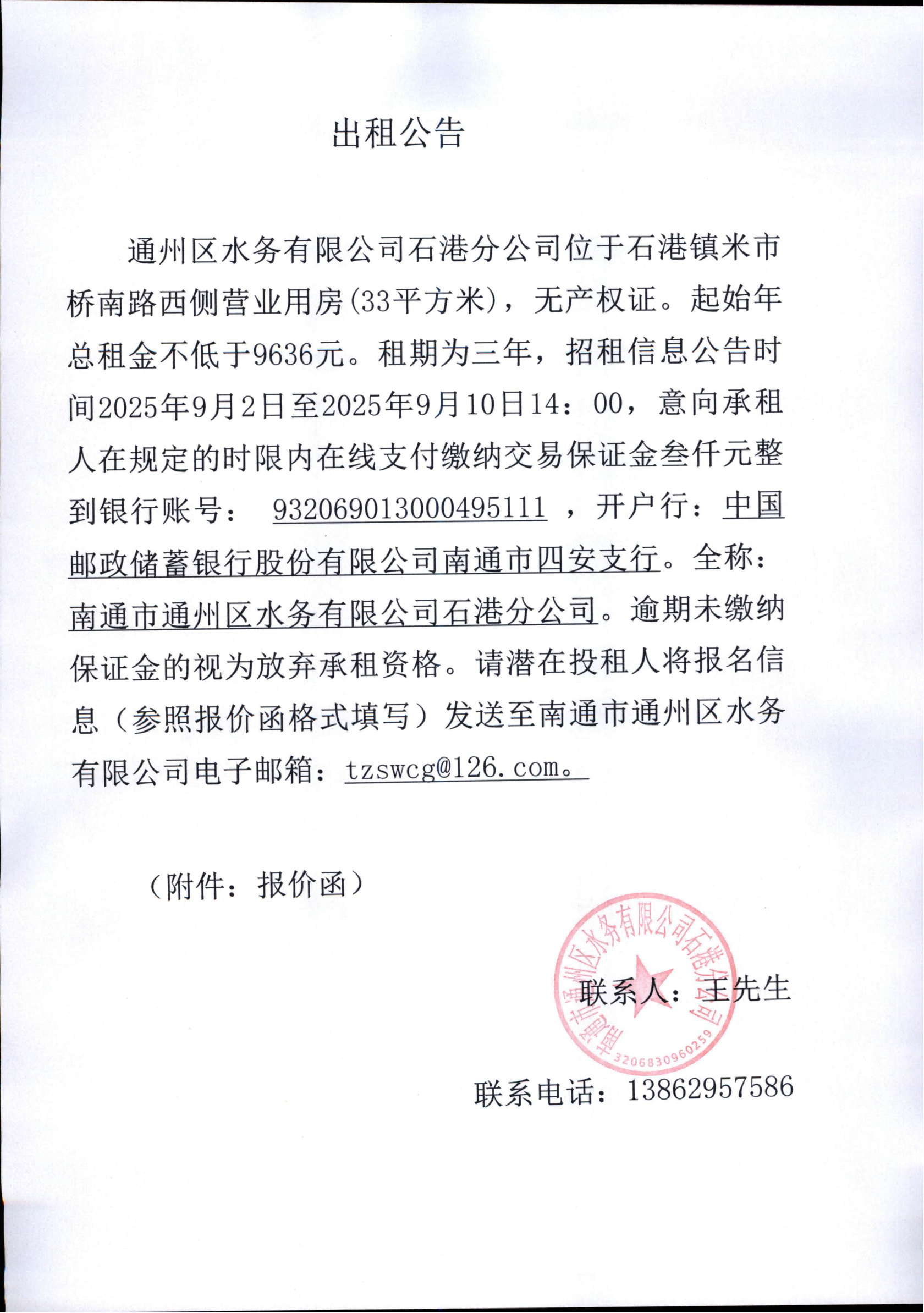 - 南通市通州區水務有限公司石港分公司米市橋南路西側營業用房(33平方米)出租公告2025-09-01